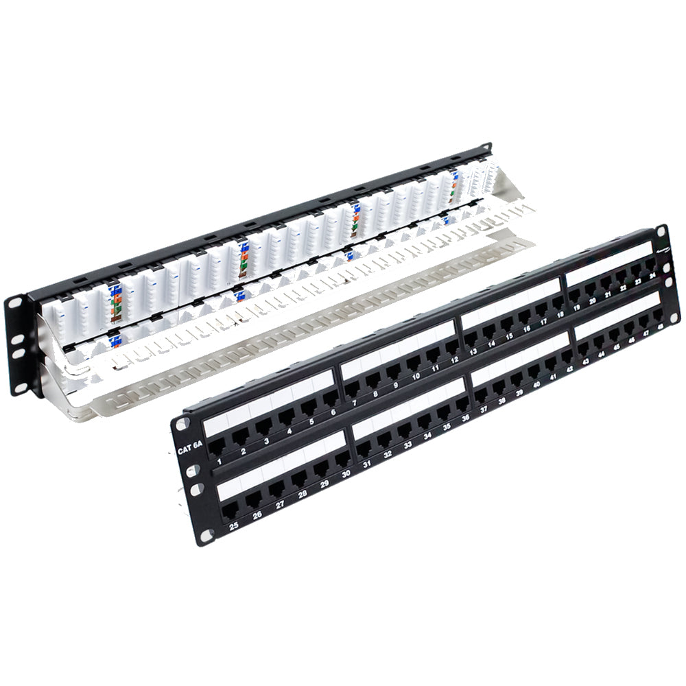 Category 6A CAT6A 2U 48‐port, 110‐Type UTP, 10G Patch Panel is component compliant to ANSI/TIA Category 6A connecting hardware requirements. The vertical 110‐Type insulation displacement connectors (IDCs) are designed to provide optimum permanent and channel link performance. The vertical termination also help reduces potential Alien Crosstalk (ANXT) with adjacent UTP cables. The jack ports and 110‐IDC punch down are grouped n six‐ port modules for quick and easy labeling and maintenance.