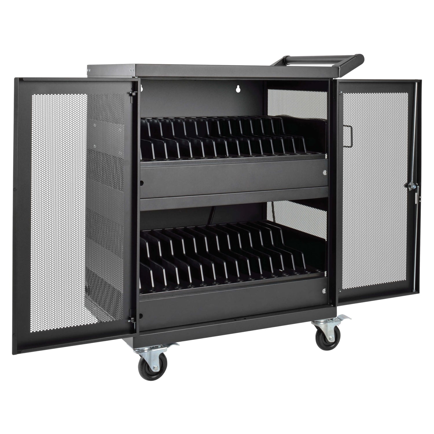 Locking steel cart provides AC charging, secure storage and cord management for up to 32 Chromebooks and laptops. Recommended for education, office, commercial, retail, industrial and healthcare environments.